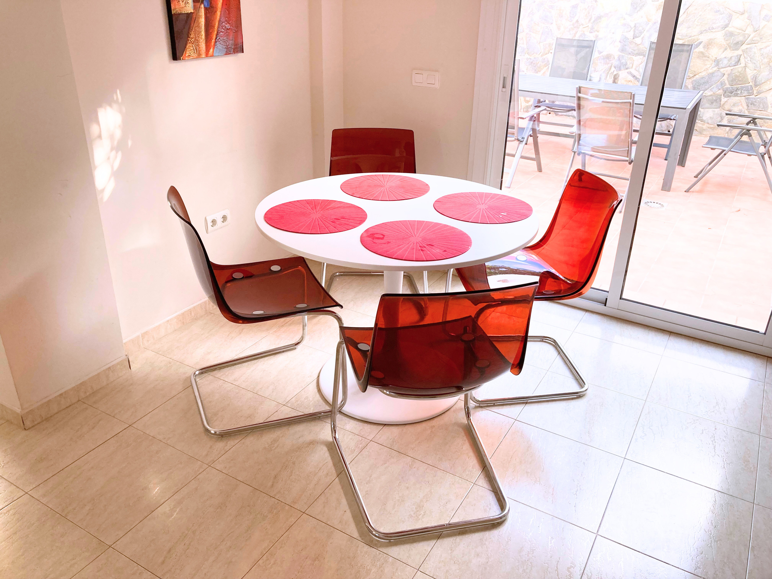 Radhuset har 4 fina terrasser. Från vardagsrummet går du ut till en stor uteplats med grill och matplats. Från vardagsrummet kan du även gå ut till en andra terass i västläge med solskydd, som ligger på första våningen framför huset. Denna terrass har även en matplats. På andra våningen finns en liten terrass i sydvästläge utanför master bedroom med soffbord och två stolar. Det finns också en stor takterrass med solstolar och matbord och en utedusch. Här kan du tillbringa en fantastisk tid med att sola och äta medan du njuter av den härliga utsikten över bergen och havet.