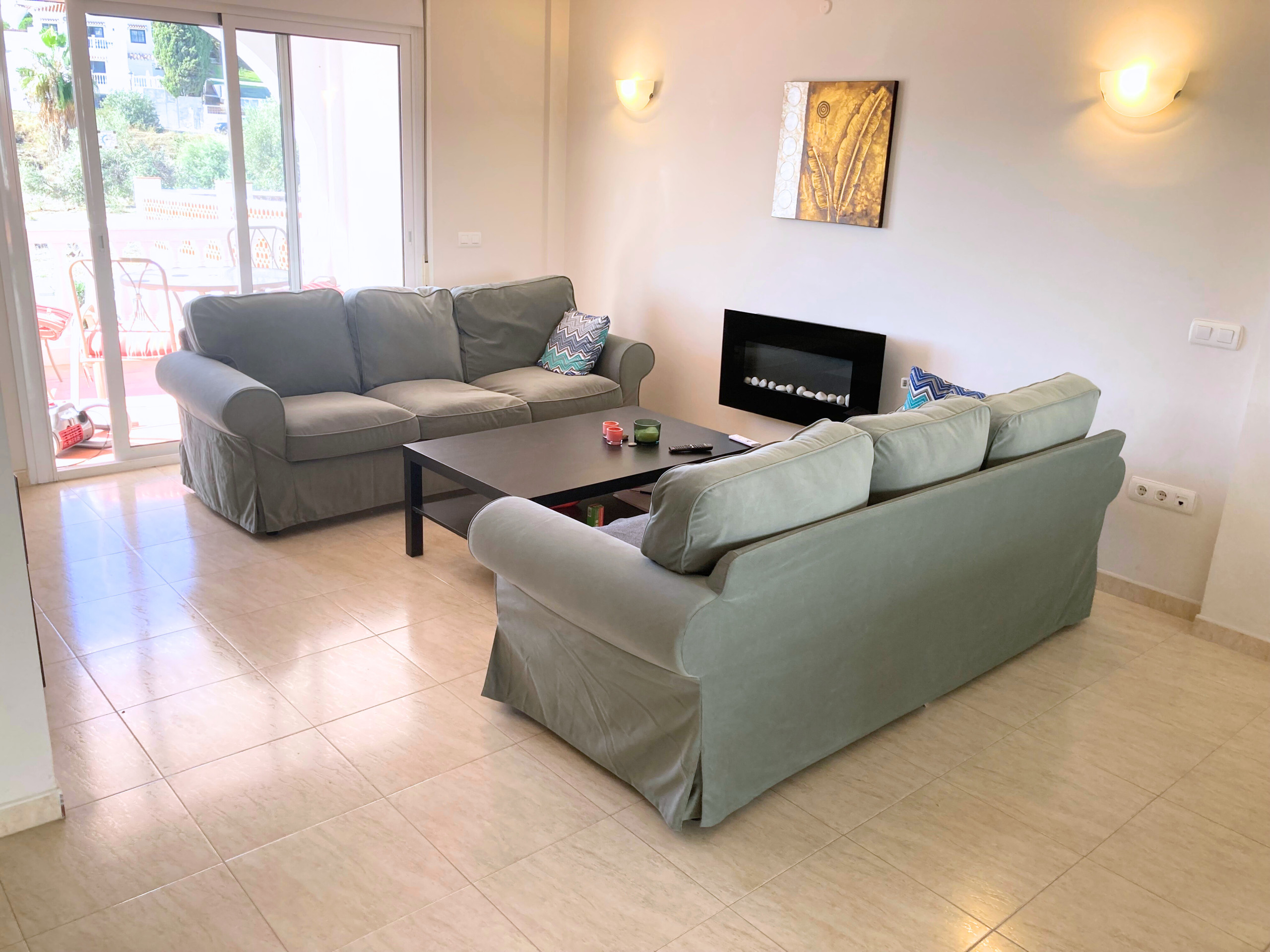 Radhuset består av 3 sovrum och ett stort öppet vardagsrum med mycket ljus och 2 stora badrum plus en mindre gästtoalett. Här finns också ett fullt utrustat kök med keramikhäll, kyl och frys, tvättmaskin, diskmaskin, köksredskap, porslin och bestick, kaffebryggare och brödrost.