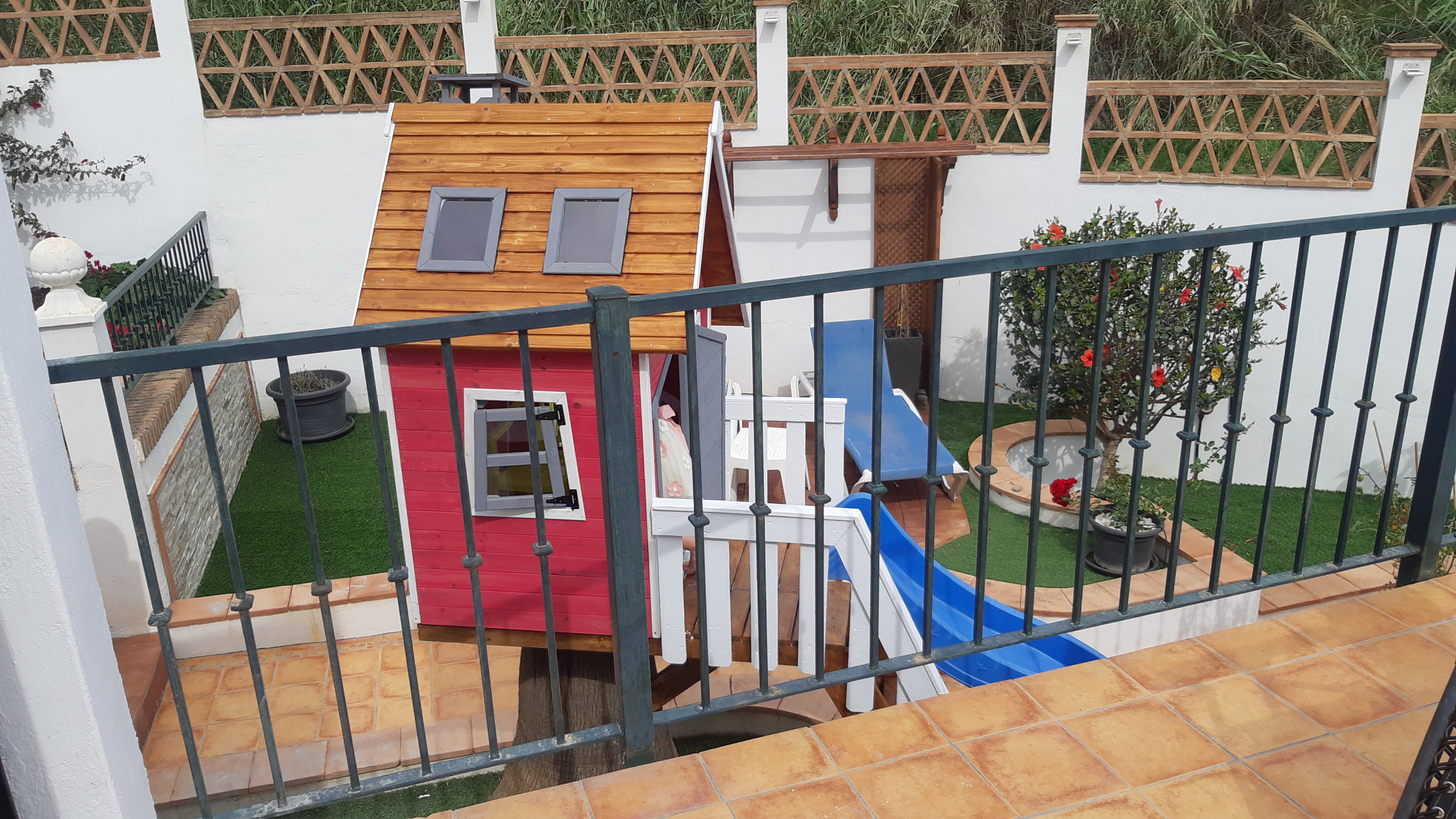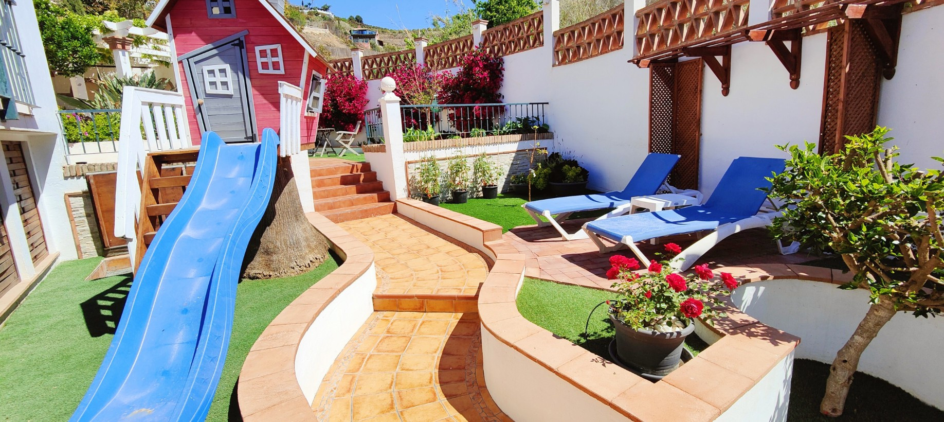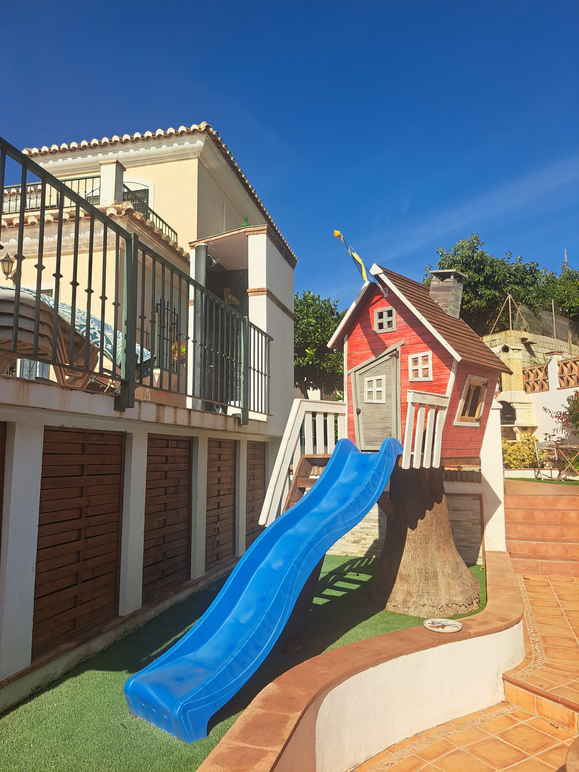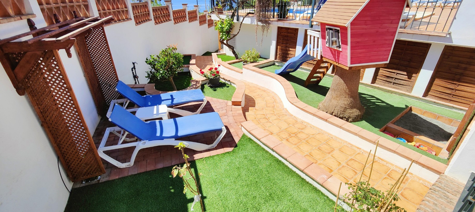 På vänster sida av terrassen finns en vacker chill out-zon med en bekväm soffa, bord och grill. Härifrån finns det några trappor som tar dig till lekområdet med ett litet lekhus med rutschkana och en sandlåda med leksaker. Det finns även solstolar i detta område så att du kan njuta av solen och titta på dina barn.