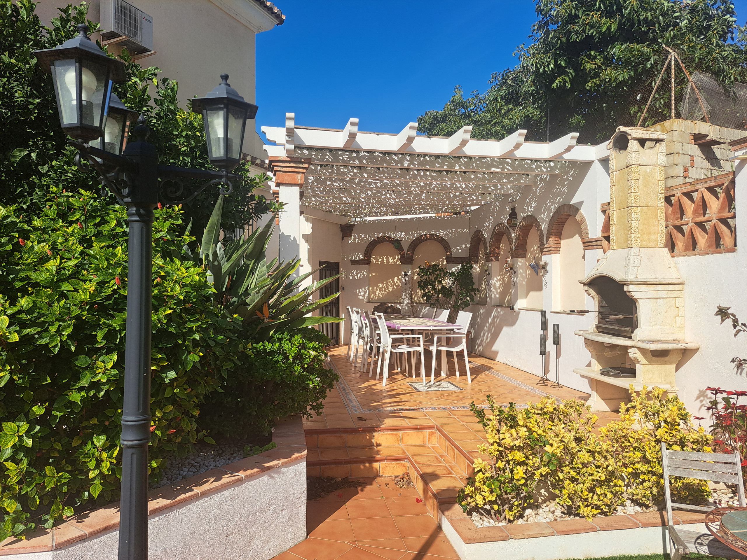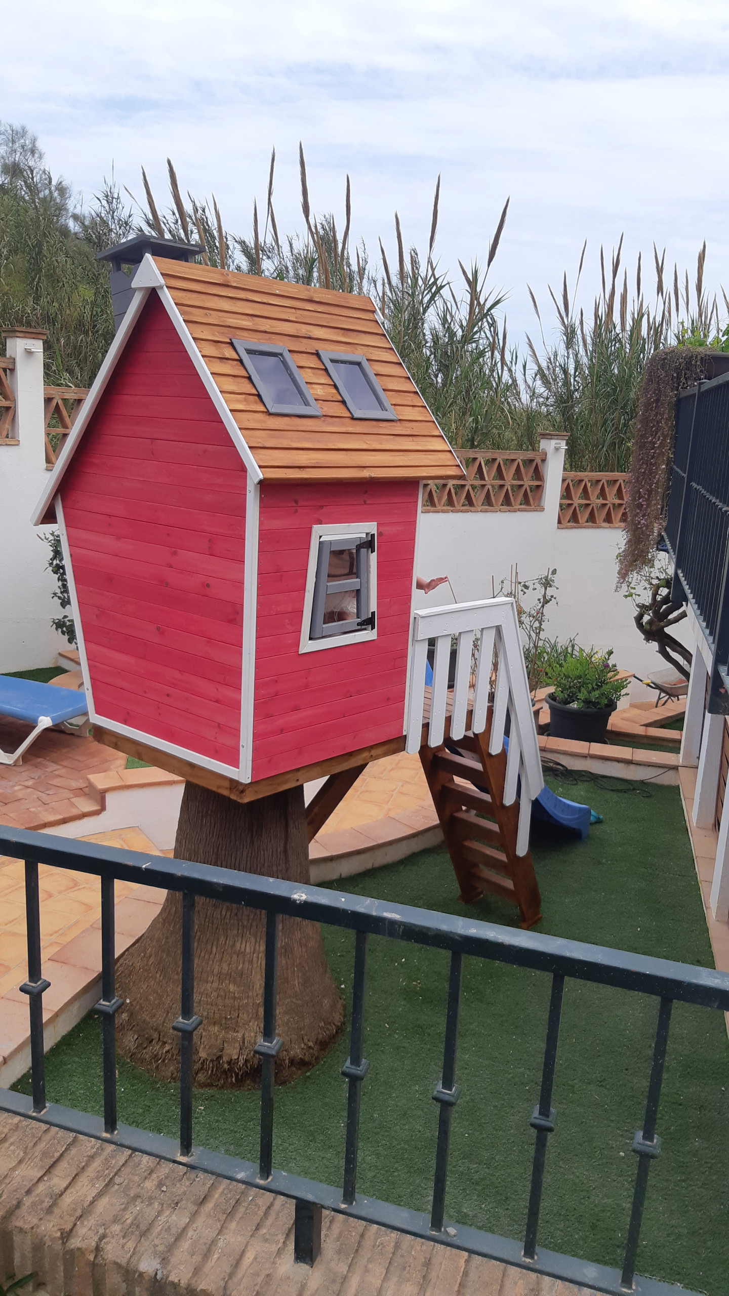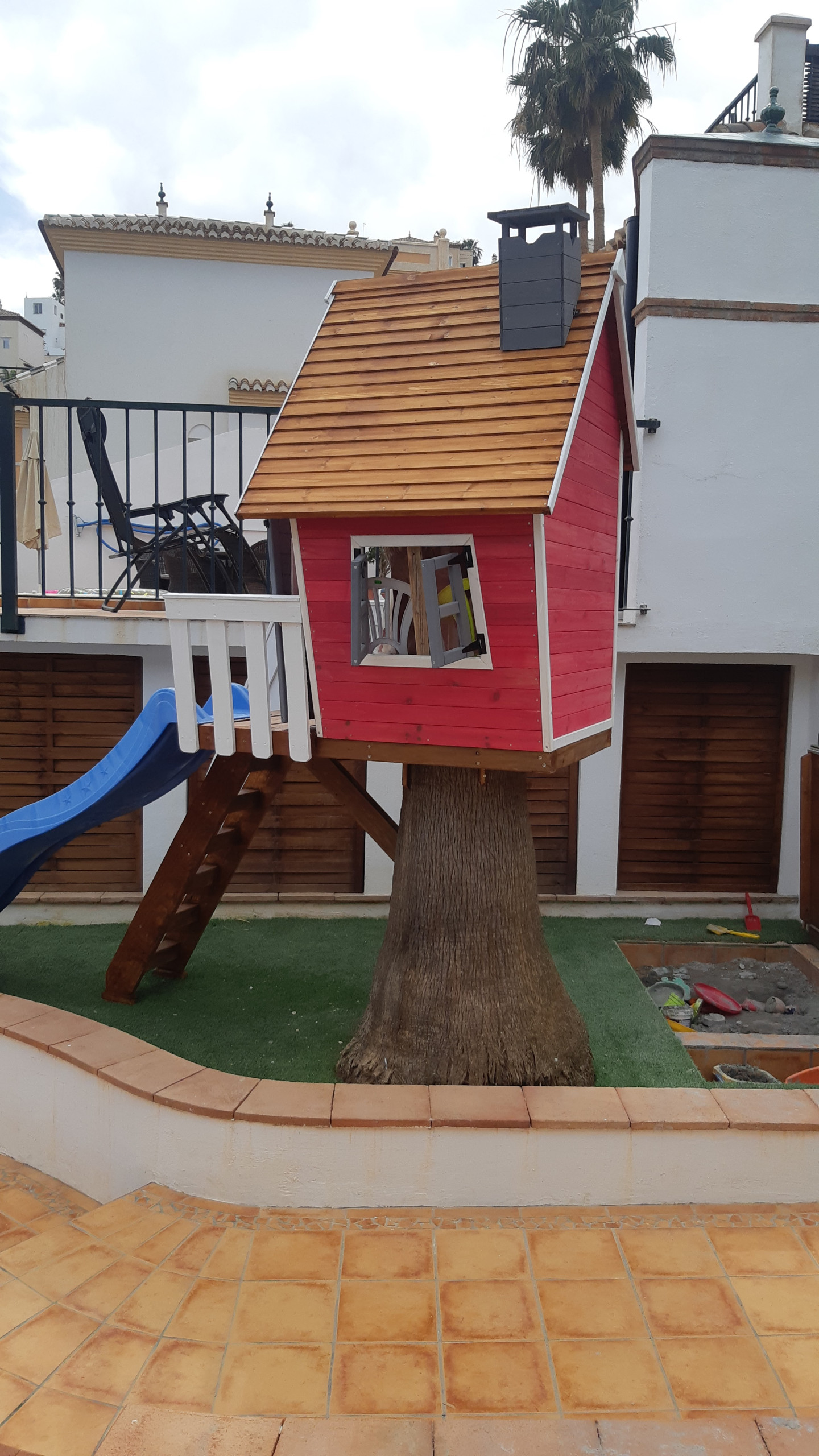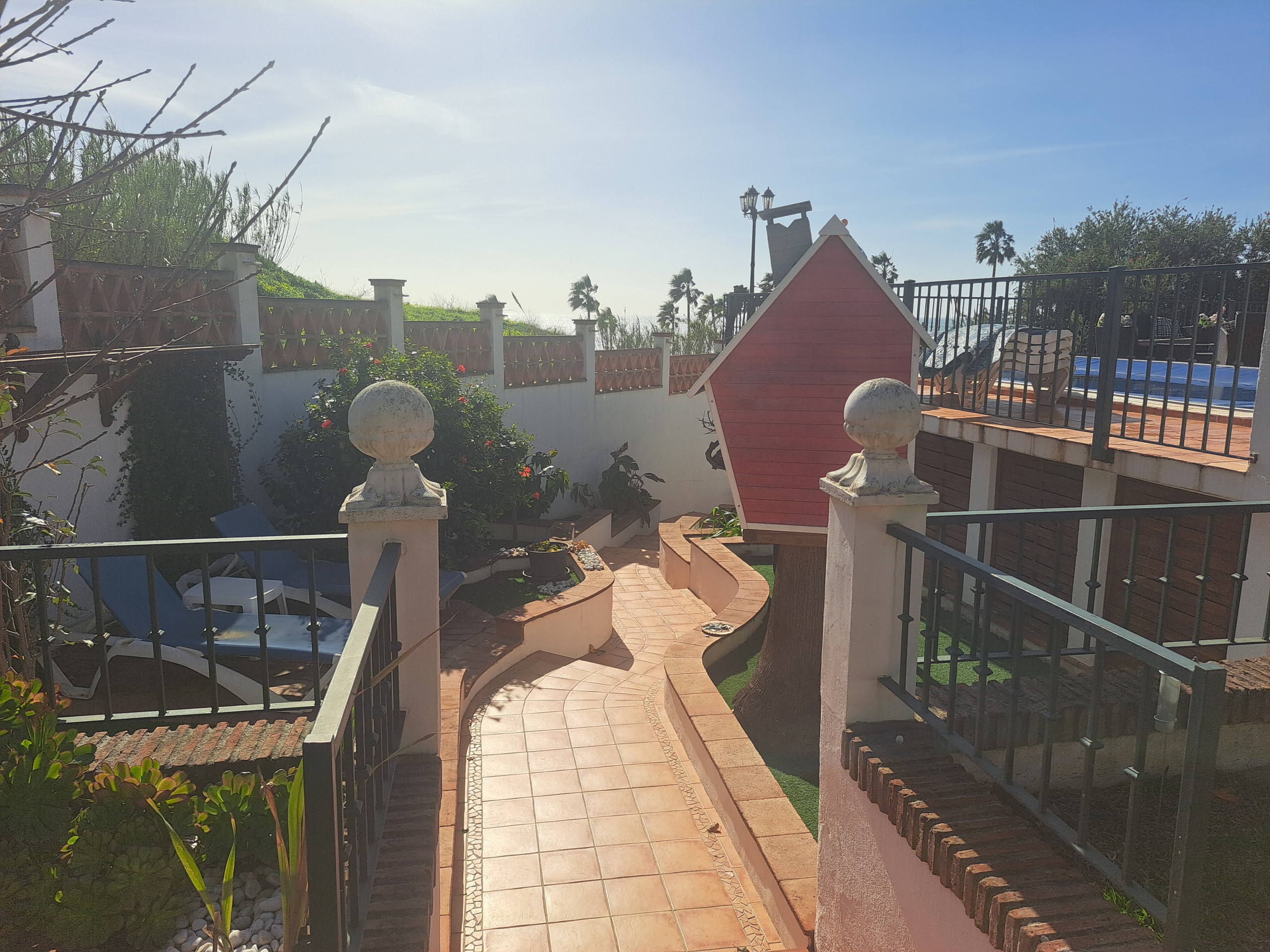 På vänster sida av terrassen finns en vacker chill out-zon med en bekväm soffa, bord och grill. Härifrån finns det några trappor som tar dig till lekområdet med ett litet lekhus med rutschkana och en sandlåda med leksaker. Det finns även solstolar i detta område så att du kan njuta av solen och titta på dina barn.