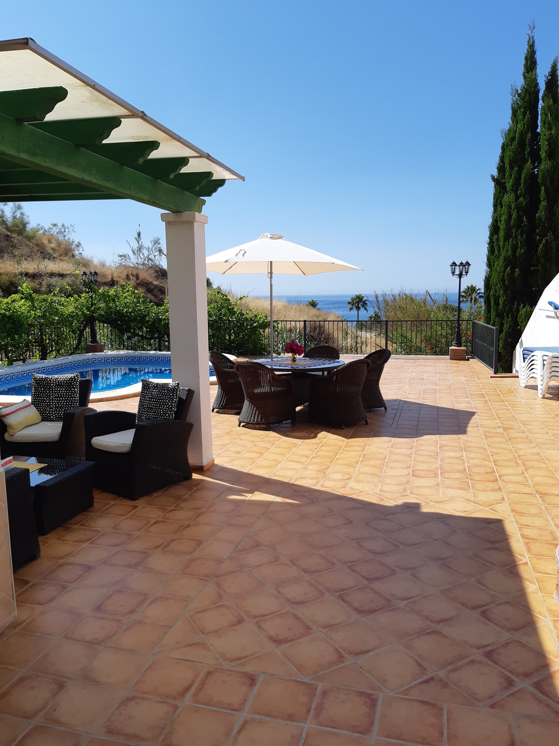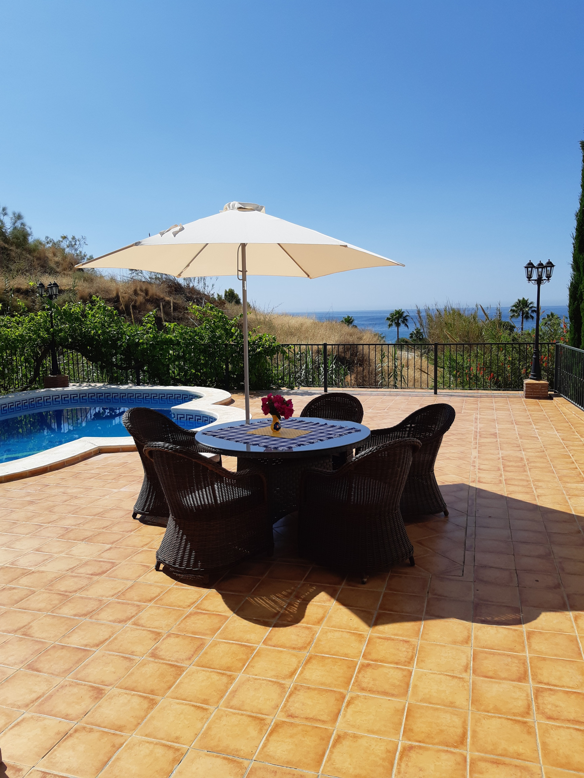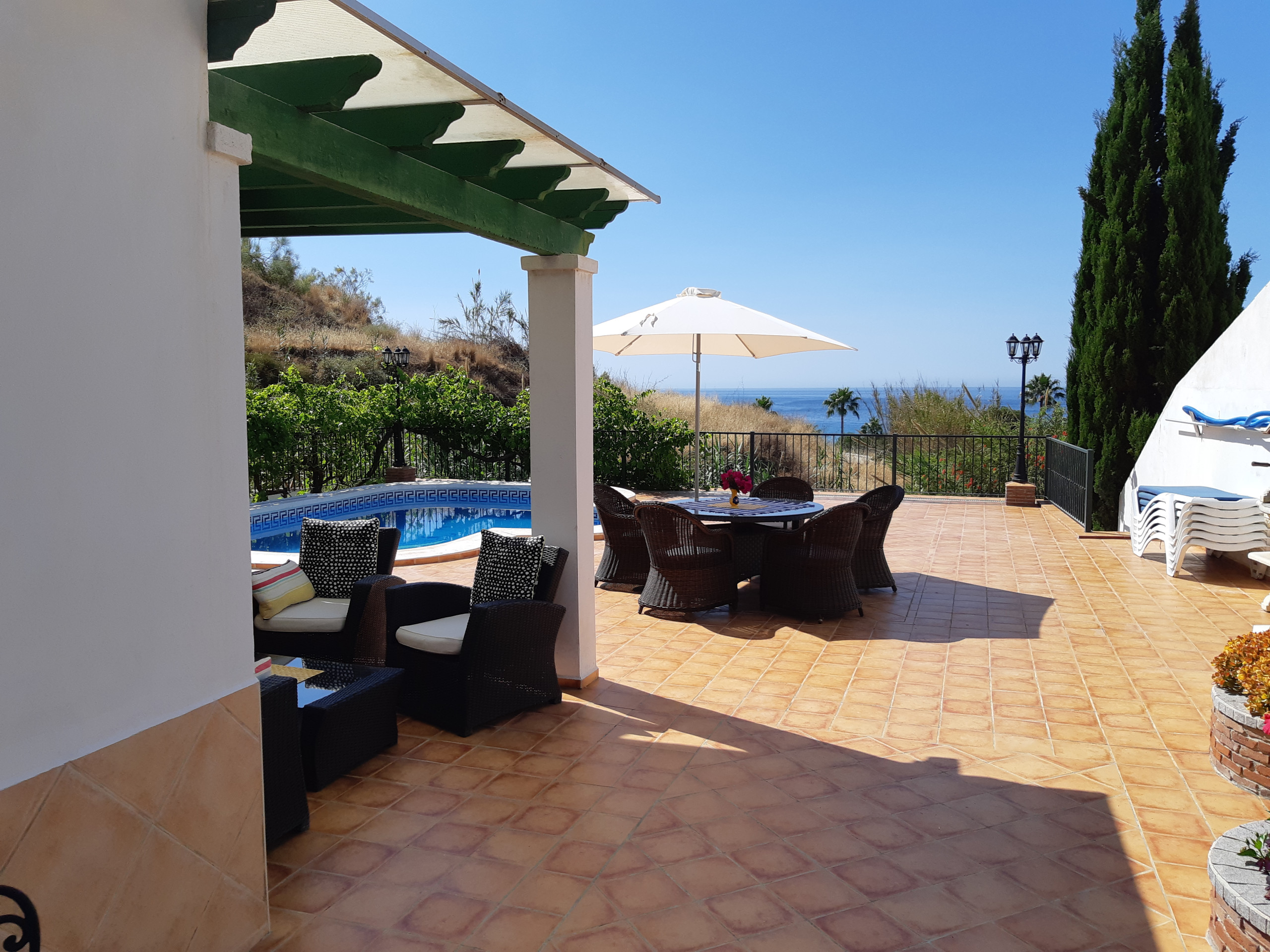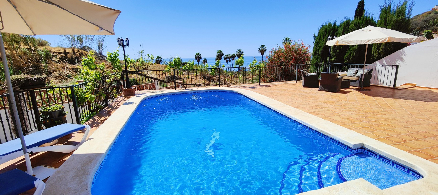 Vacker villa belägen i den lugna urbaniseringen Tamango Hill, alldeles i utkanten av Nerja och 600 meter från närmaste strand. Med fantastisk havsutsikt, stor privat pool, olika terrasser och plats för upp till 7 gäster.