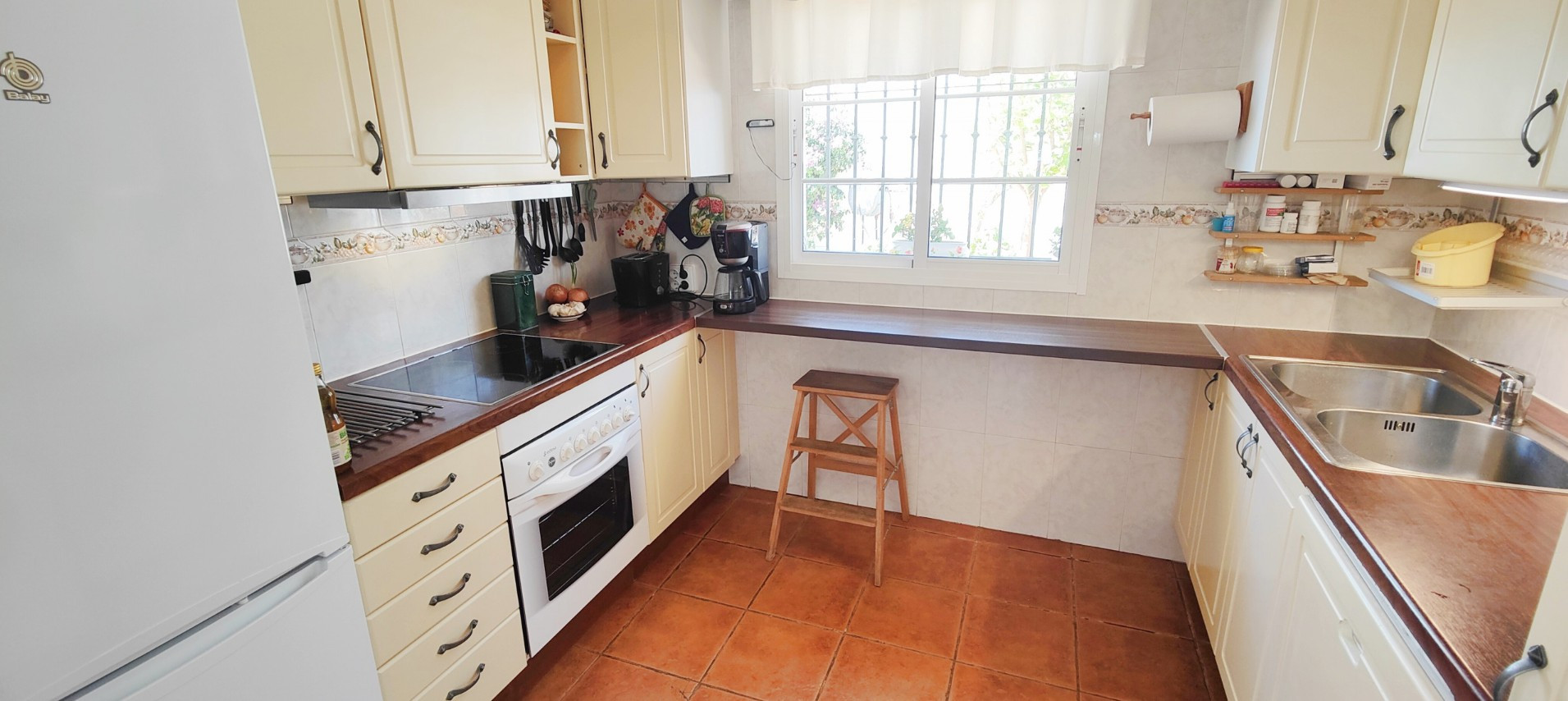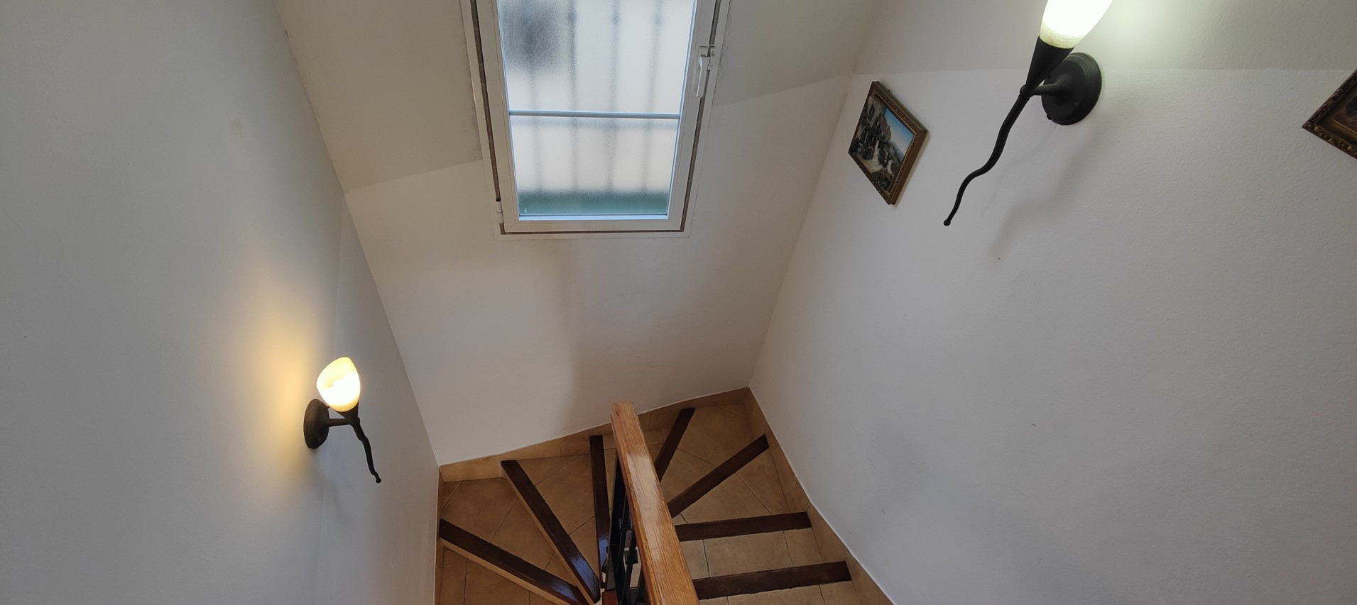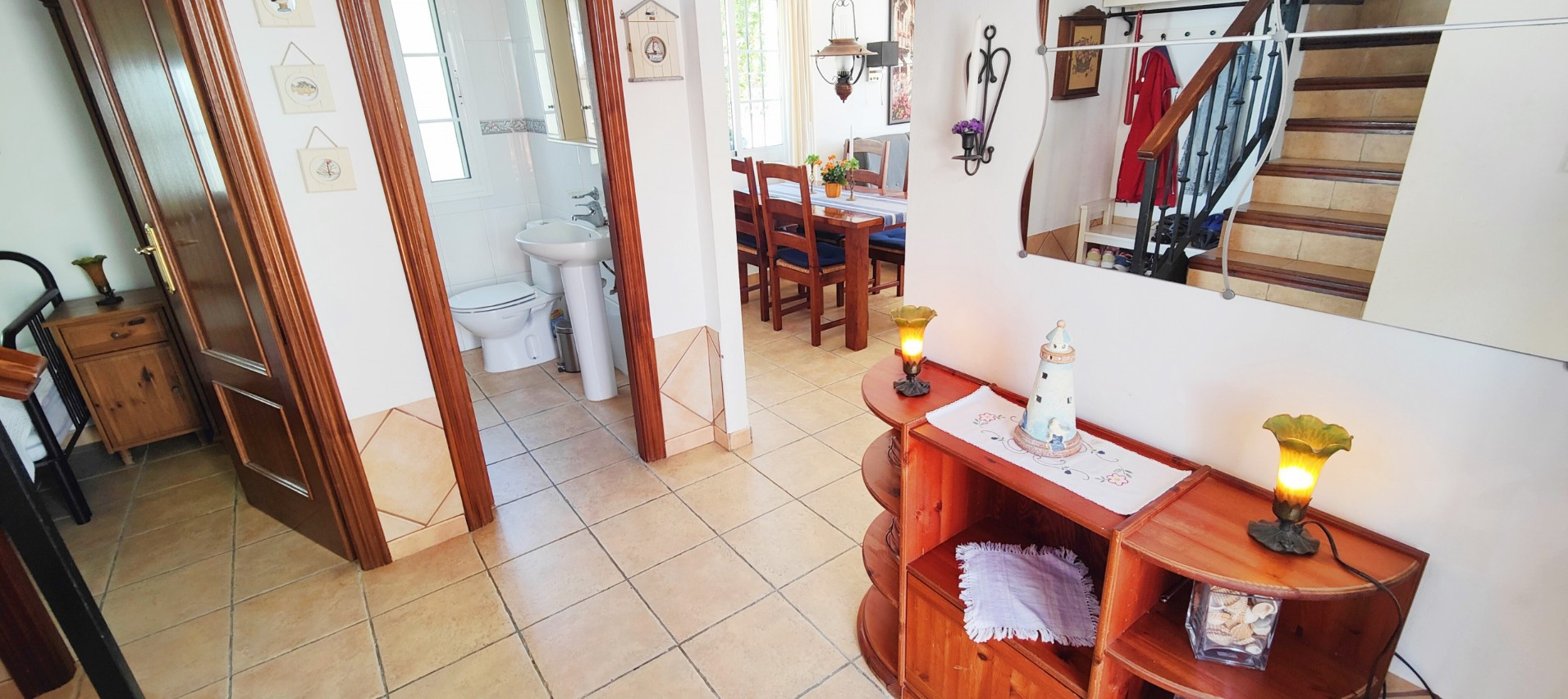 Vid ingången finns en stor, inhägnad privat parkeringsplats för upp till två bilar. Boytan är fördelad över 2 våningar och består av följande: bottenvåningen har ett litet sovrum med en enkelsäng och en garderob, en gästtoalett, ett fullt utrustat kök som är utrustat med alla nödvändiga redskap, porslin, kyl-frys, elektrisk ugn och keramikhäll, brödrost, kaffebryggare, mikrovågsugn, tvättmaskin och diskmaskin.