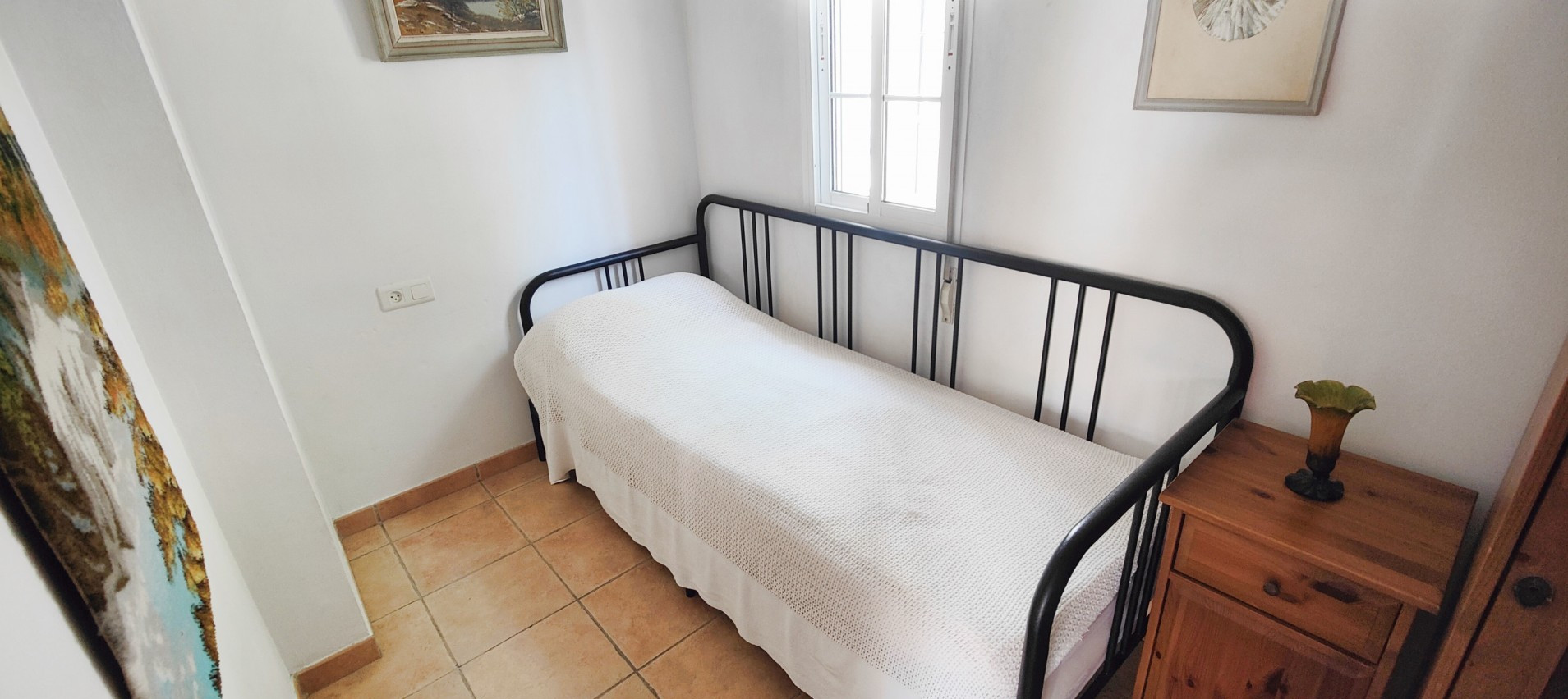 På andra våningen finns två sovrum, ett sovrum med en dubbelsäng, AC med varm/kall luft och direkt tillgång till en balkong i söderläge möblerad med en solstol, ett bord och två stolar. Härifrån kan du njuta av den fantastiska havsutsikten. Det andra sovrummet har två enkelsängar, AC med varm- och kallluft och inbyggda garderober. Båda dessa rum delar ett stort familjebadrum med badkar.