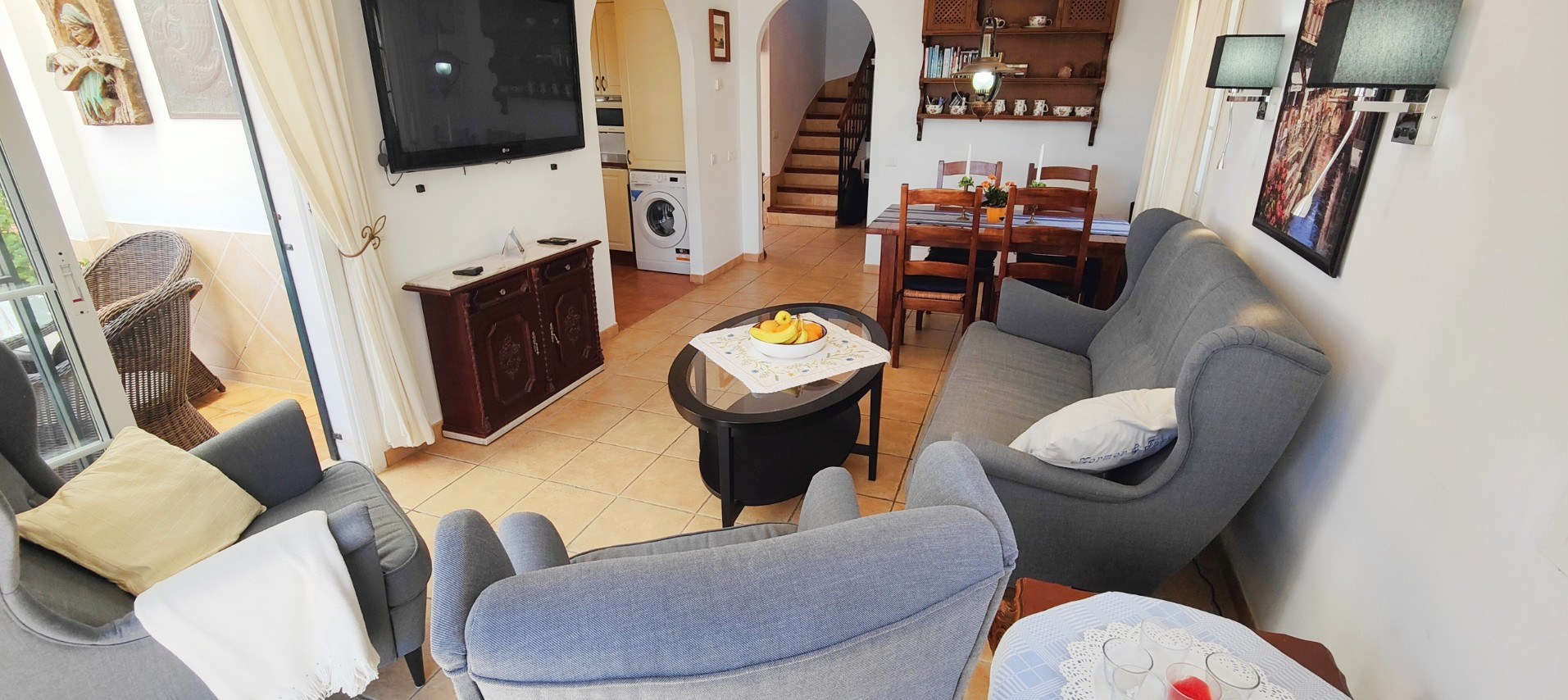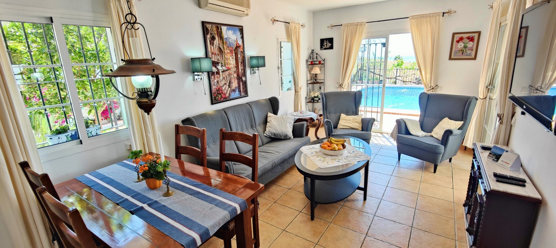 Det gemensamma vardagsrummet/matsalen är möblerat med ett utdragbart bord och stolar, en bekväm 3-sitssoffa och två fåtöljer. Det finns Wi-Fi, nationell TV och varm/kall luftkonditionering.