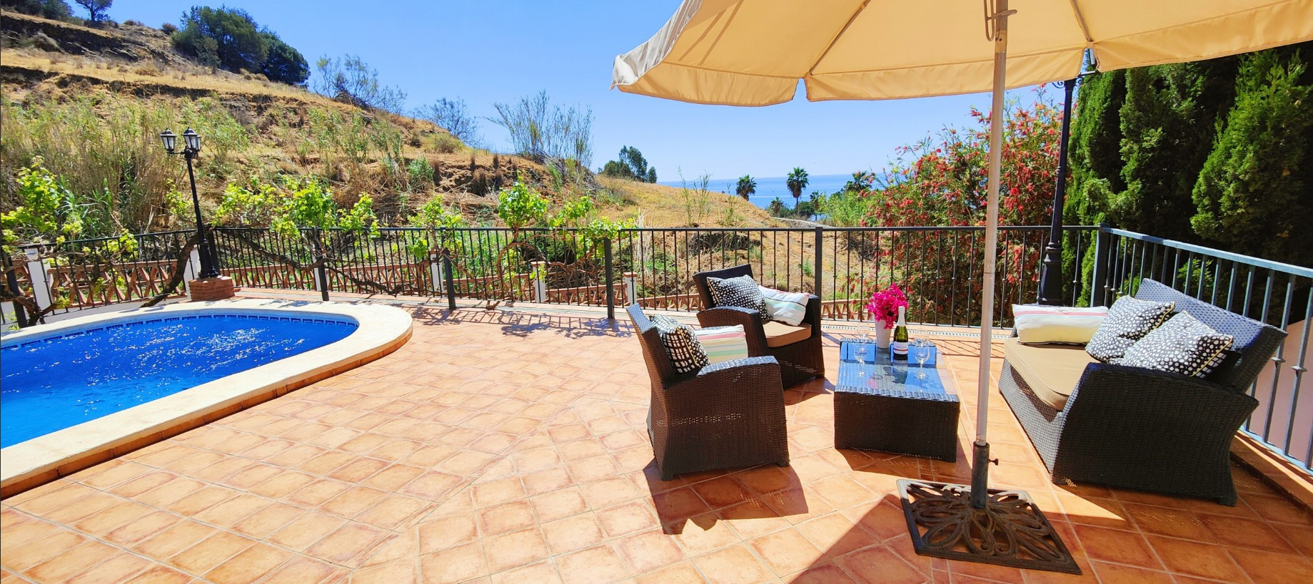 Denna villa är verkligen enastående och erbjuder spektakulär utsikt runt hela fastigheten. Hela utomhusytan är fylld med vackra blommande blommor och grönska. Sammantaget är detta det perfekta semesterhuset för alla familjer som vill njuta av det spanska klimatet och koppla av.